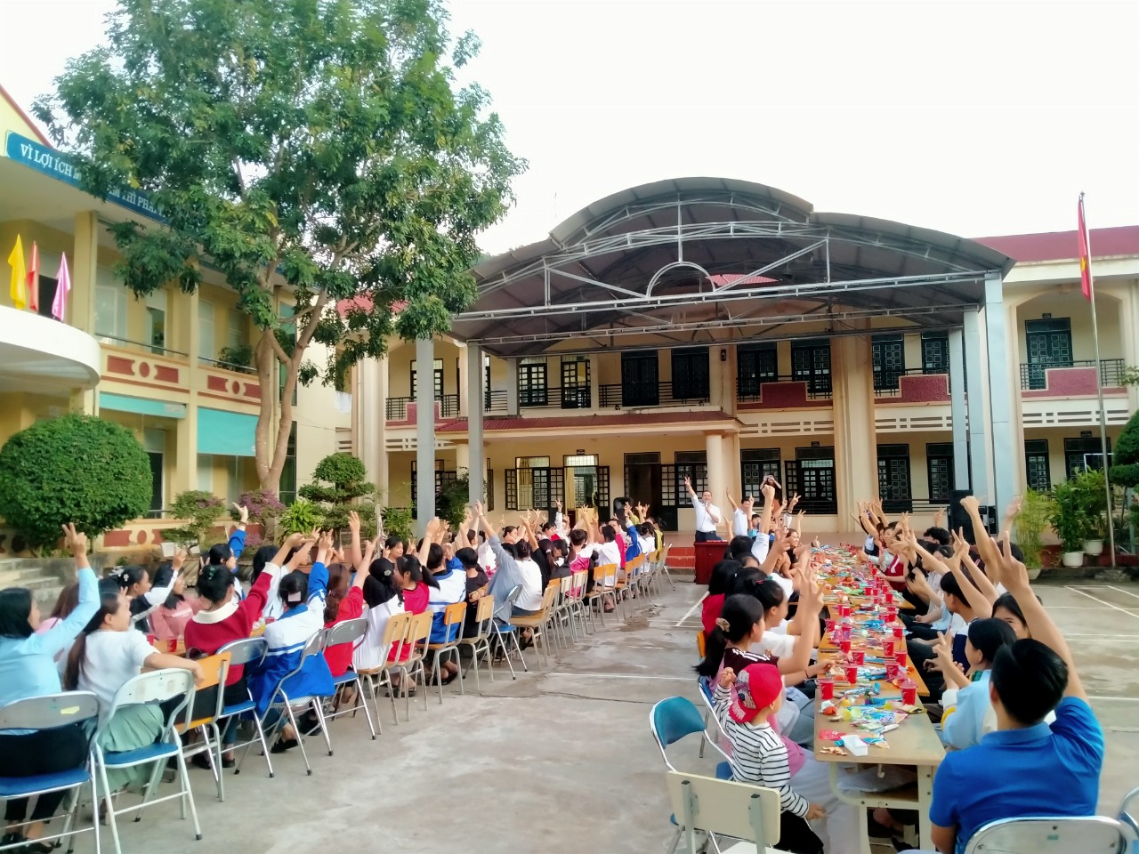 Các em học sinh cùng các thầy cô giáo đồng lòng hô vang CHIẾN THẮNG trong cuộc gặp mặt.