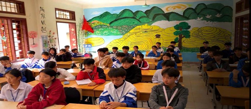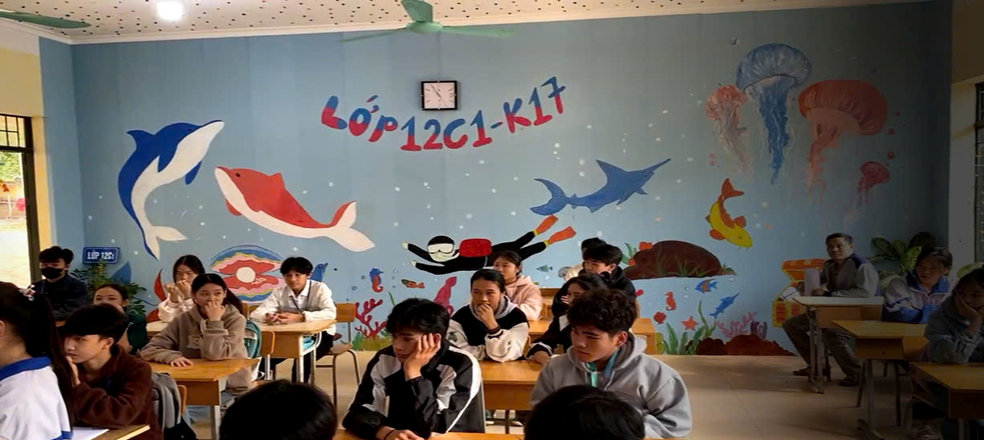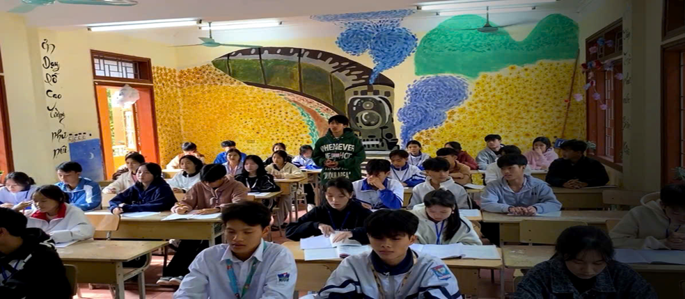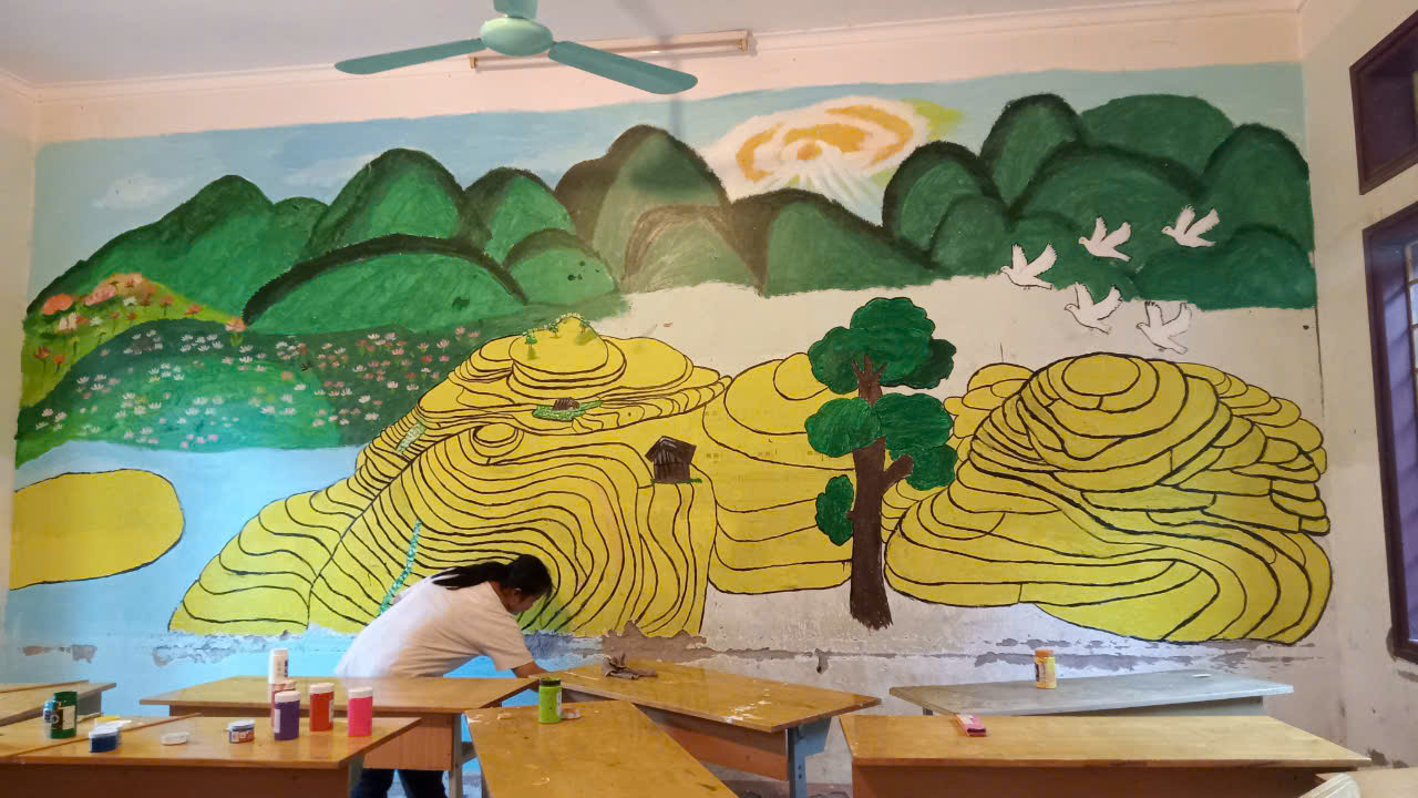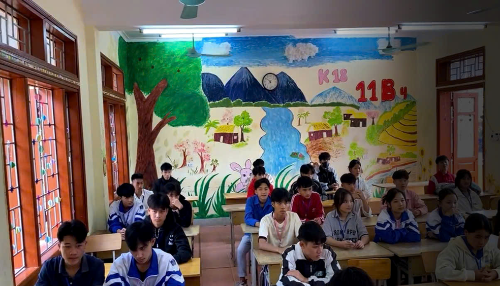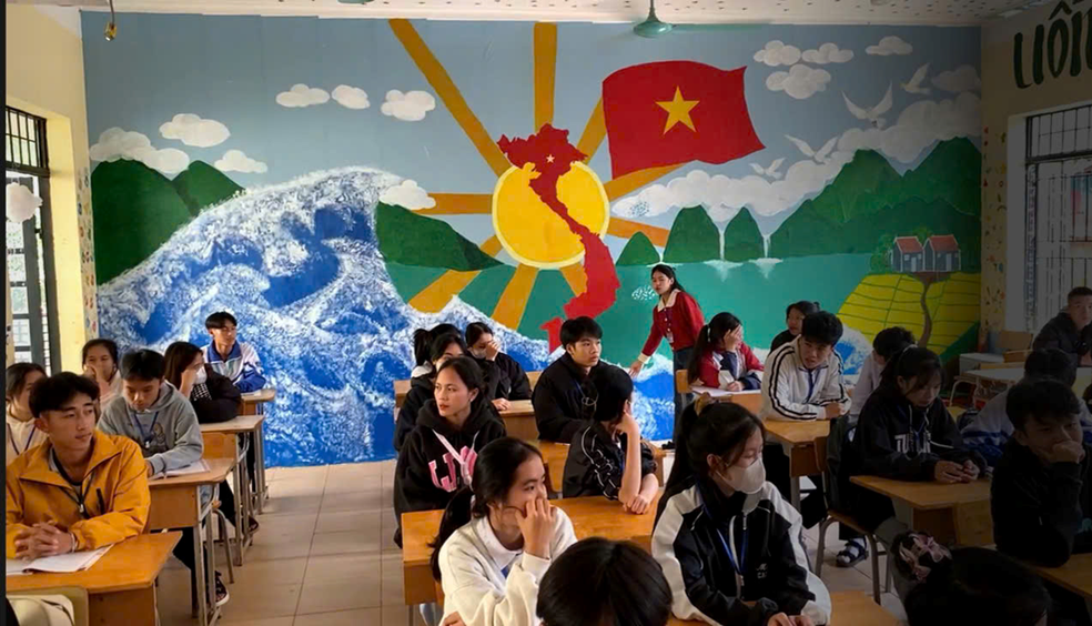 Học sinh lớp 10A4 đang tỉ mỉ vẽ bức tranh ruộng bậc thang với núi non trùng điệp